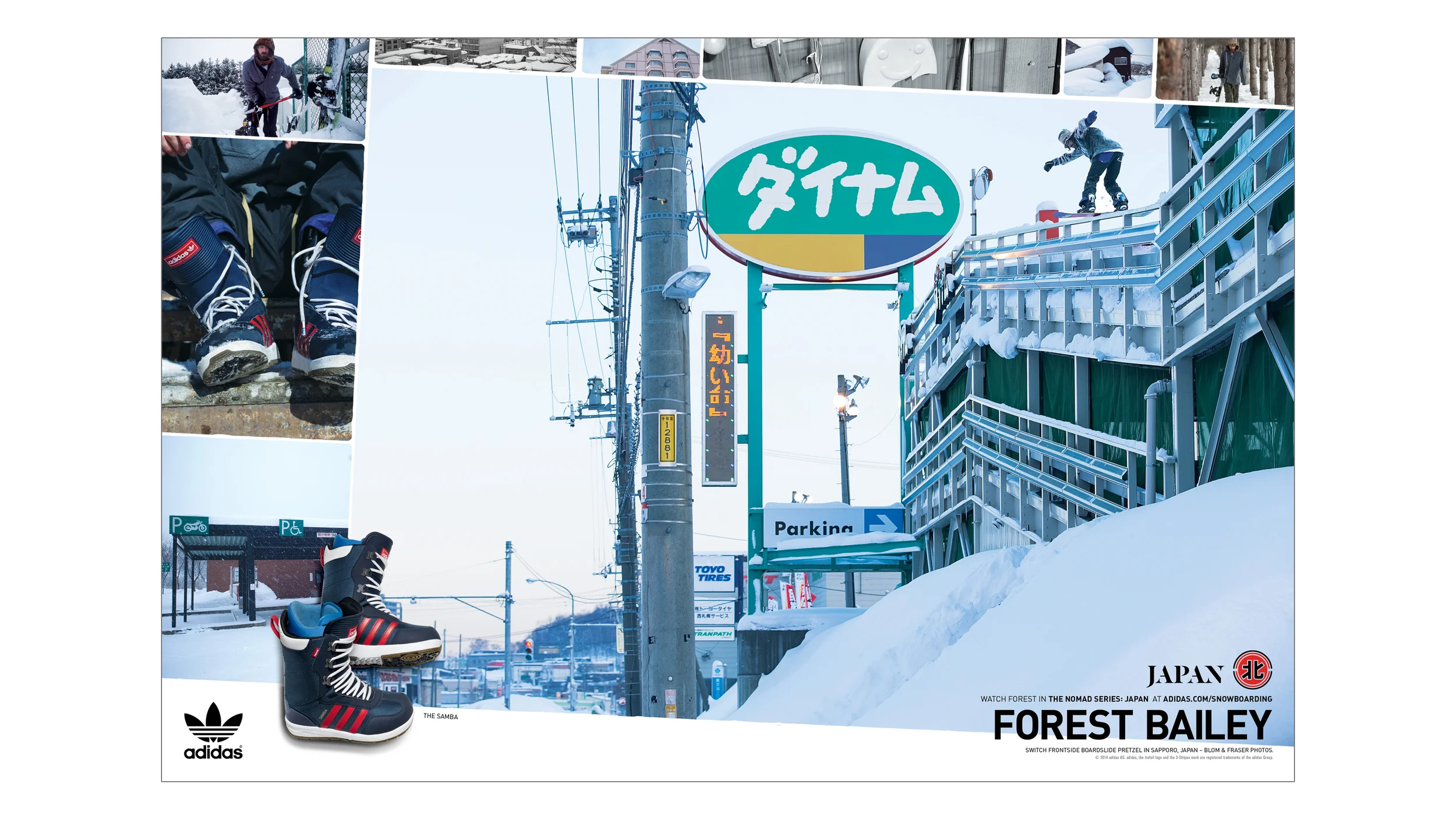 Season two for adidas Snowboarding was a time to take the "Welcome_________" approach from the first season and develop it into a more diverse and layered campaign. We shot in Japan, backcountry BC, and Trans-Siberia to gather content for a season of promotion based on our film series, ads, retail tools, PR and stickers for snowboards.